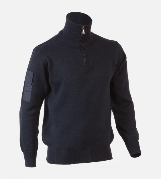 Naturaltek wool/microfiber zip turtle-neck sweater with patches. Wearability designed to be worn under operative conditions, guarantees thermal protection, body temperature control, breathability, comfort and long-term use.